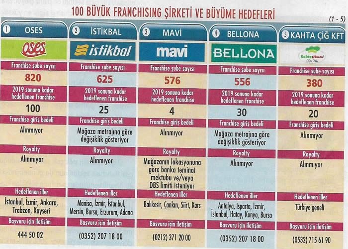 Franchise sektöründeki trendleri değerlendirdiğimiz kapak haberimizde 100 markanın franchising koşullarını ve 2018- 2019 yılı hedeflerini araştırdık. Yaptığımız hesaplamalara göre bu 100 marka, 2019 yılı sonuna kadar toplam 2 bin 273 franchise şube açacak.